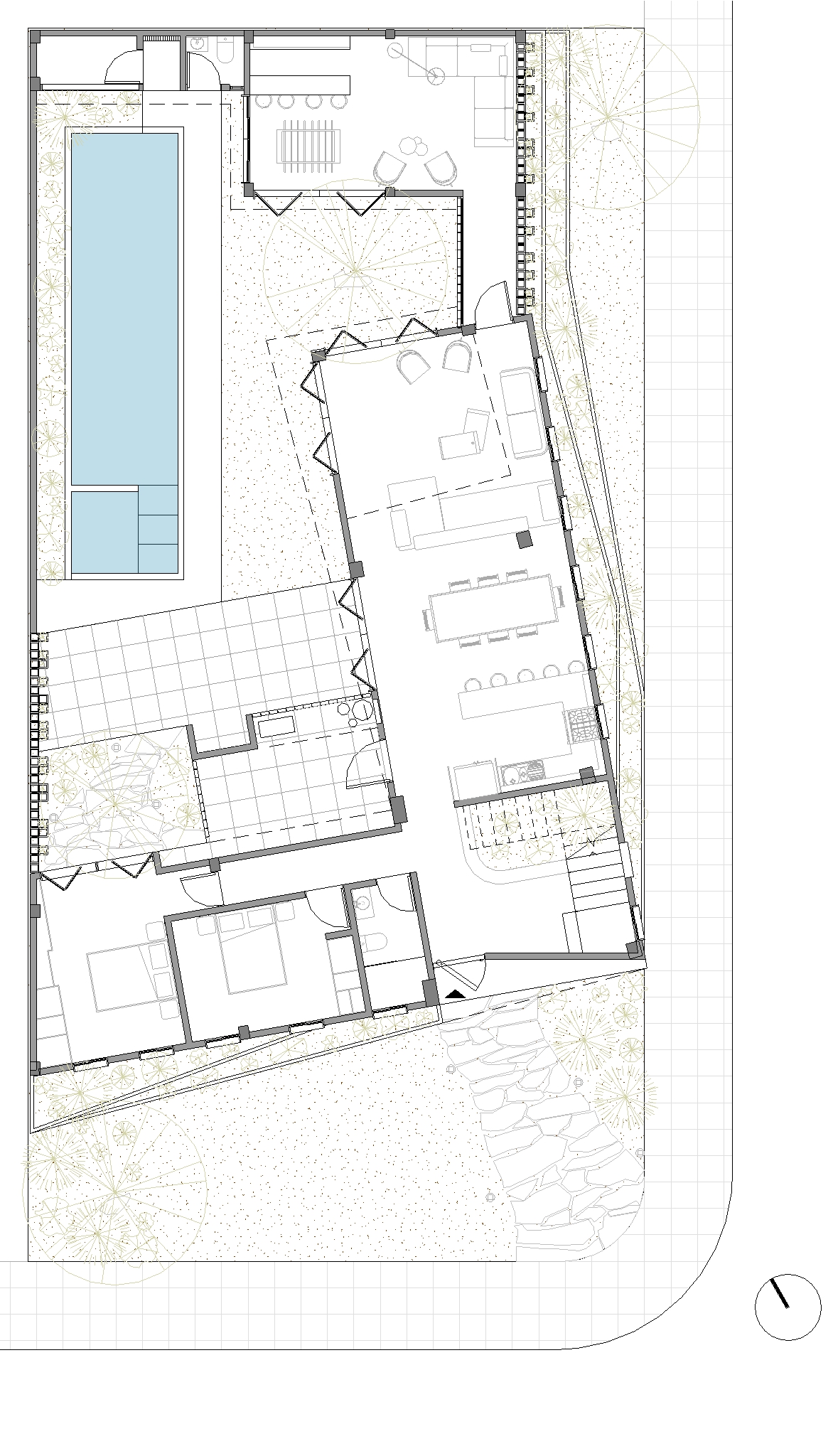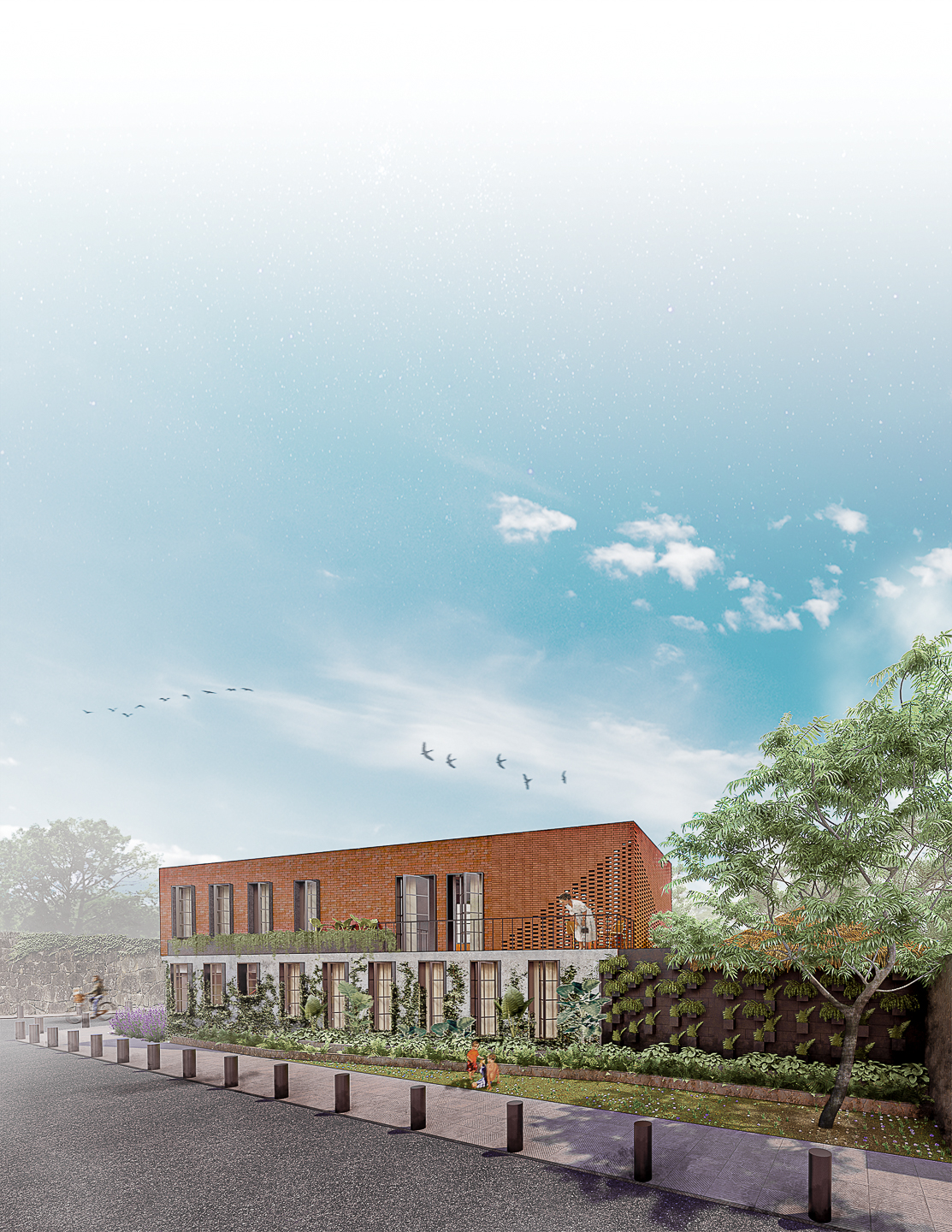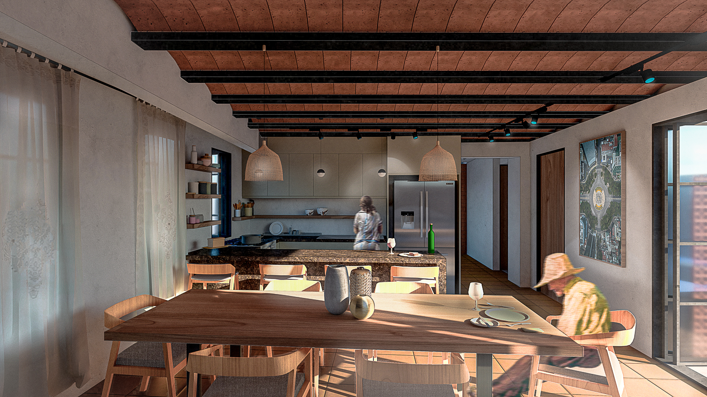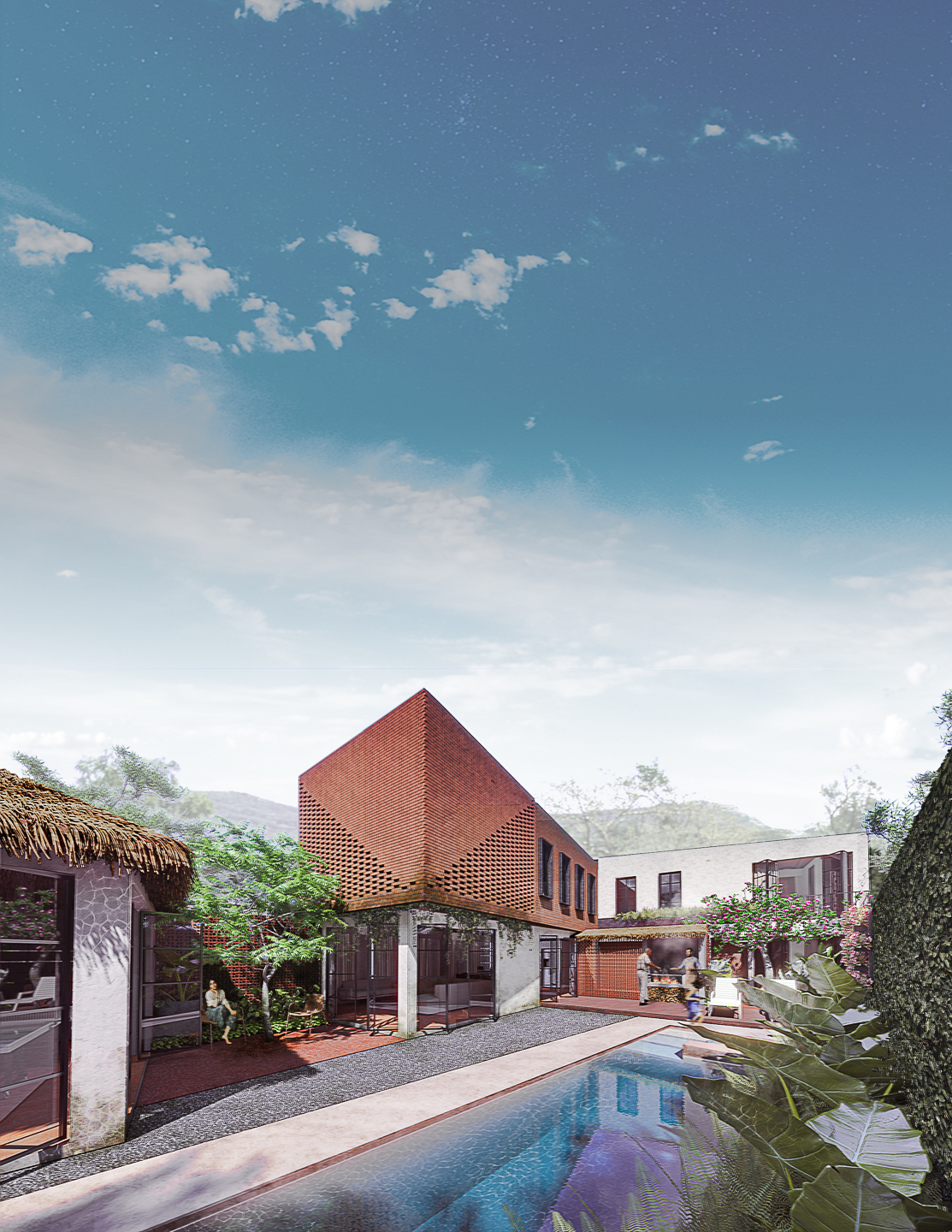 La casa se inspira en la arquitectura tradicional de la región, utilizando materiales locales y sostenibles que le dan un aspecto rústico y acogedor. El barro rojo, la piedra laja, las fibras naturales y una techumbre de madera y hoja seca de palma son los elementos perfectos para dotar de las comodidades que requiere el clima frio de la zona.
